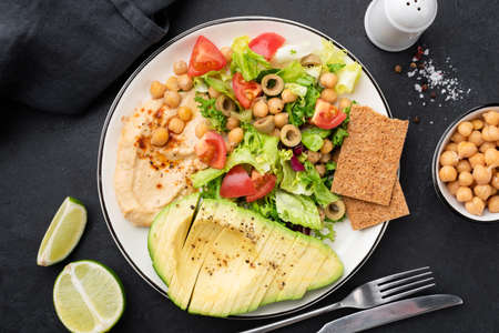 Healthy salad on plate with avocado, hummus and vegetables on a plate, top view. black stone background