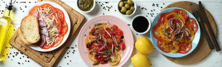 Top view on buffet with food variety, copy space. Table with different appetizing snacks and free space on white wooden background. Restaurant, menu, cuisine, banquet concept