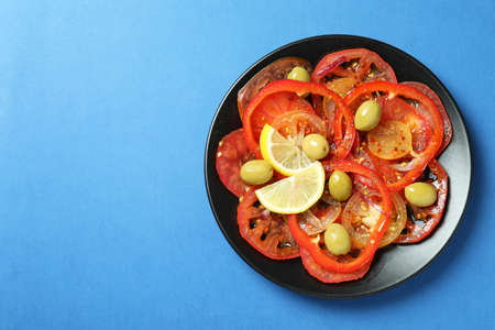 Traditional Italian Pasta salad. Orecchiette Arlecchino, roasted tomatoes, onion, black olives, lime, feta cheese, olive oil, spices and herbs. Cooking process. Part of add-ins in the plate. Top view.