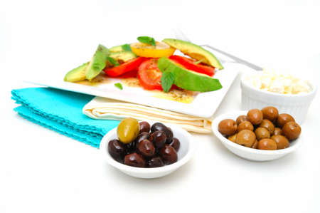 Greek salad with feta cheese, olives, tomatoes, cucumbers, olives, olive oil and pita bread