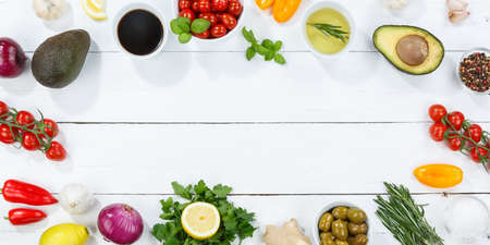 Healthy vegan food background clean eating copyspace copy space vegetarian organic on a wooden board banner