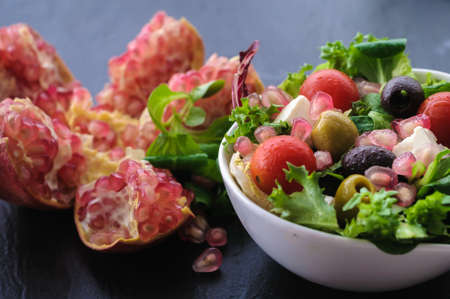 vegetarian food is salad, canonigo tomatoes olives pomegranate, and feta cheese. on a black background