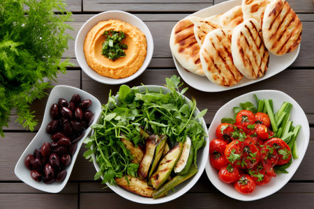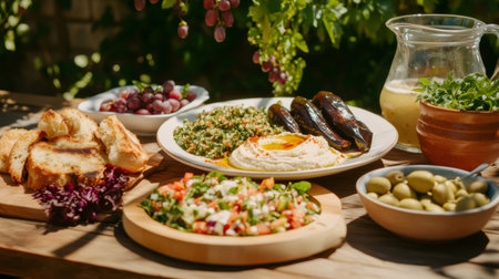 Vibrant Mediterranean plant based meal featuring hummus, baba ghanoush, tabbouleh, salad, olives, bread, and grapes, served outdoors