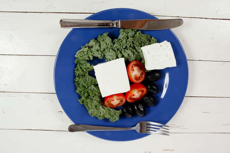 Greek salad with feta cheese and olive oil on plate. Greek healthy food