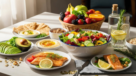 A vibrant display featuring a grilled fish paired with an assortment of fresh vegetables and fruits, showcasing a healthy, organic aesthetic perfect for culinary presentations.