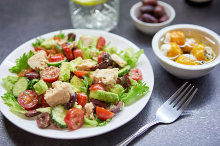 Salad with tuna, lettuce, cucumbers, tomatoes, olives and avocados in white plate on the table
