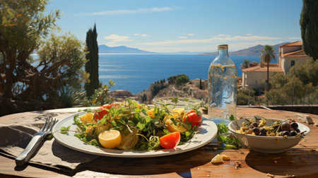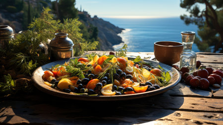 A sunny coastal setting for a healthy lunch with fresh produce and a clear view of the sea