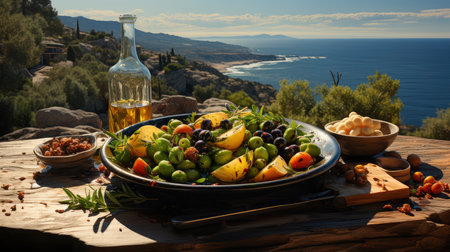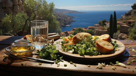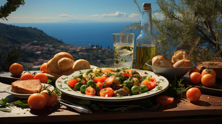 A rustic outdoor picnic set against a Mediterranean sea backdrop, featuring fresh produce, bread, and wine