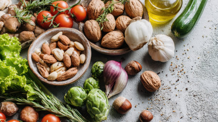 Different fresh vegetables, greens and salami sausage on the table before cooking. Healthy mediterranean eating concept.