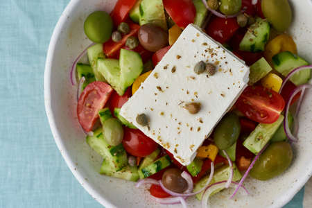 Part of Greek village salad horiatiki with feta cheese and vegetables, vegetarian mediterranean food, low calories keto dieting meal, top view, , close up