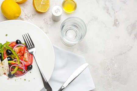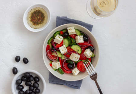 Greek salad with tomatoes, cucumbers, cheese, onions, peppers and olives. Healthy eating Vegetarian food