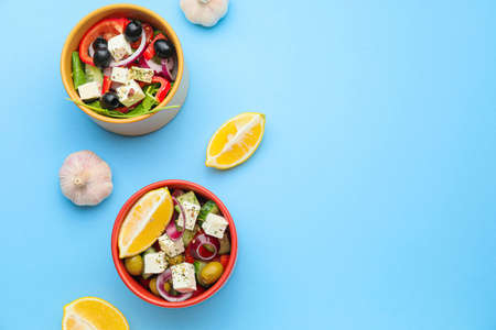 Two blue bowls with Greek salad of fresh juicy vegetables, feta cheese, herbs and olives on a white wooden background. Horizontal orientation. close-up. Copy space.