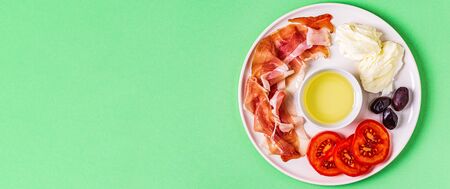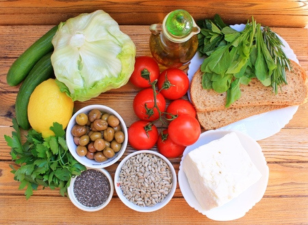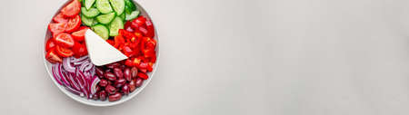 Ingredients for classic greek salad in a bowl with copy space banner.