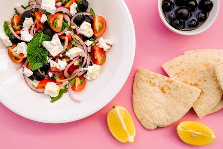 Greek salad with feta cheese, tomatoes, olives and pita bread