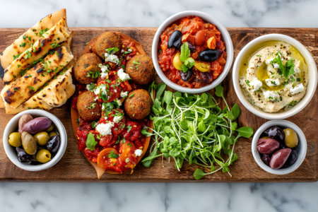 Sharing platter presenting falafel, hummus, olives, and fresh herbs, creating a vibrant and colorful culinary experience