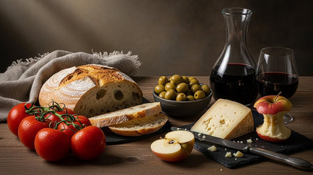 A still life composition featuring rustic bread, fresh tomatoes, cheese, olives, and a carafe of red wine.