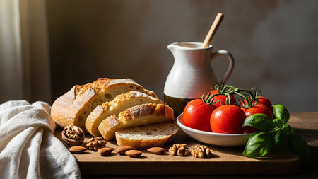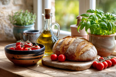 Freshly baked loaf of bread with cherry tomatoes, olive oil and basil on a rustic wooden table by the window, creating a cozy and inviting scene