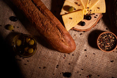 Ripe olives and ciabatta bread on cutting board. Top view flat lay