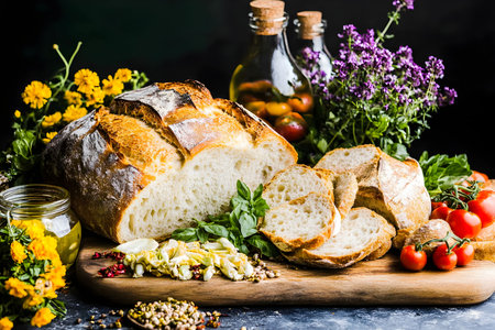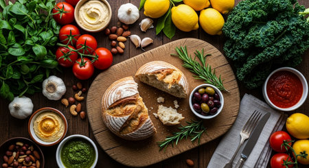 Freshly baked bread lies on a wooden board surrounded by organic vegetables, herbs, and flowers, showcasing a healthy and appetizing arrangement ideal for a farm to table dining experience.