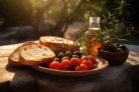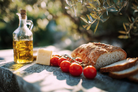 olive oil, bread and cherry tomatoes on a stone table in the garden
