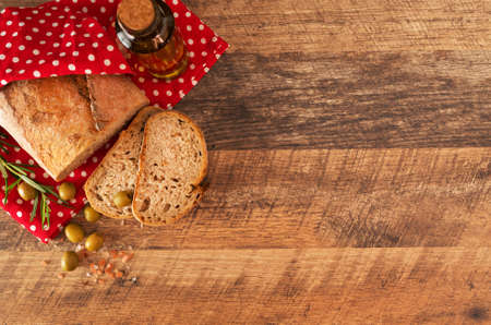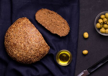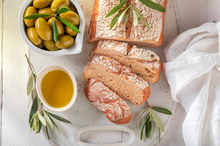 Homemade bread with extra virgin olive oil. Loaf of bread with green olives.