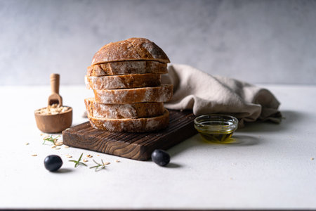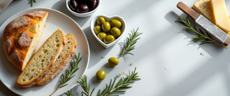 Homemade sourdough ciabatta slice bread with olives and rosemary on a white abstract table. Artisan bread