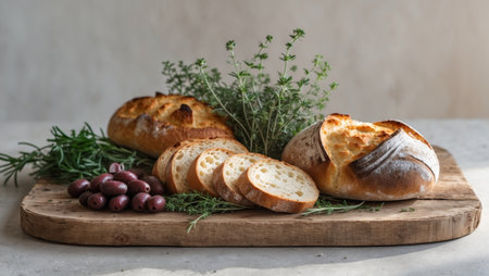 A beautiful rustic scene featuring freshly sliced bread artfully arranged on a wooden board, complemented by greenery, perfect for culinary presentations.