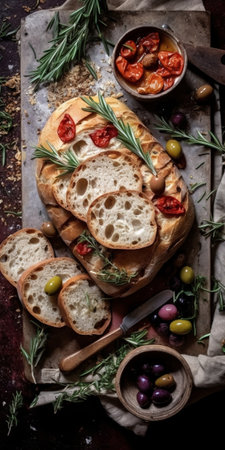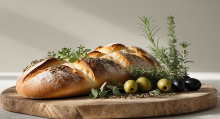 AI Generated. Fresh Bread with Herbs and Olives on Wooden Board