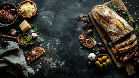 Italian ciabatta bread cut in slices on wooden chopping board with herbs, garlic and olives over dark grunge backdrop, copy space, top view