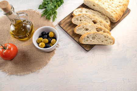 Fresh, tasty option for serving Italian focaccia. Sliced bread on serving board served with olives, tomatoes, olive oil and fresh herbs on white table with place for text. Copy space. Top view