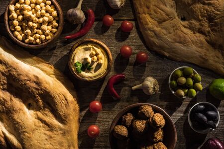 top view of delicious falafel, hummus, chickpeas, pita, vegetables and olives on wooden rustic table