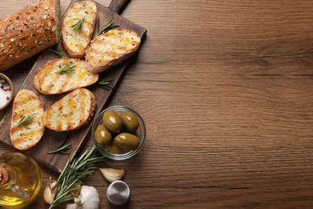 Tasty bruschettas with oil and rosemary on wooden table, flat lay. Space for text