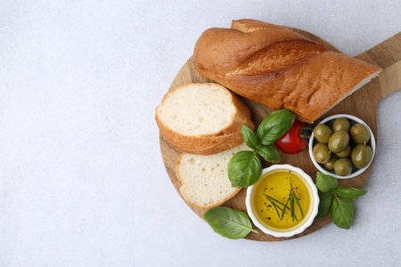 Tasty baguette served with oil, tomato, olives and basil on light gray table, top view. Space for text