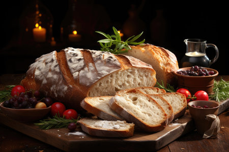 Rustic charm of freshly baked sourdough bread, cheese, and olives, accompanied by a bottle of wine, sets the stage for a delightful dining experience