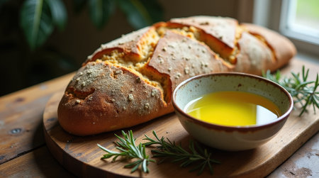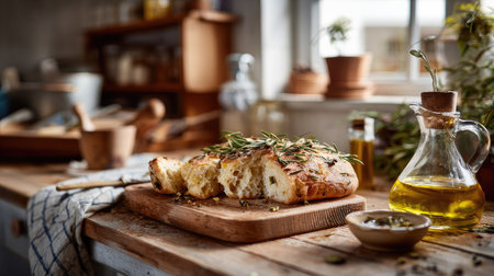 A beautifully arranged scene featuring freshly baked artisan bread topped with herbs, a glass of olive oil, and a warm kitchen atmosphere.