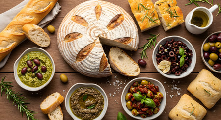 A top-down flat lay of a delicious Mediterranean appetizer spread on a wooden table. It features a loaf of sliced sourdough bread, focaccia, various bowls of olives, pesto, tapenade, and olive oil.