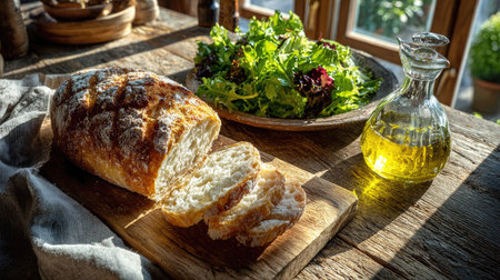 A beautifully arranged rustic wooden table featuring freshly baked artisan bread sliced, vibrant green salad, and a bottle of olive oil. Perfect for a healthy meal.