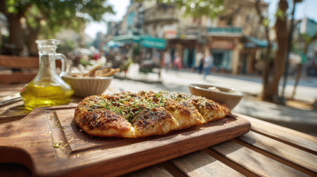 Delicious freshly baked flatbread served on a wooden board outdoors.