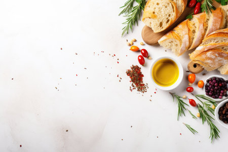Healthy food concept Organic olive oil rosemary spices bread white stone background copy space