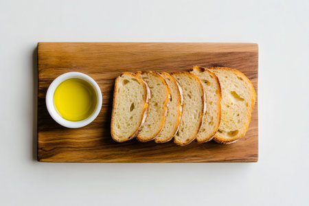 Slices of fresh artisan bread serving as a healthy snack, placed next to a bowl of extra virgin olive oil on a wooden board