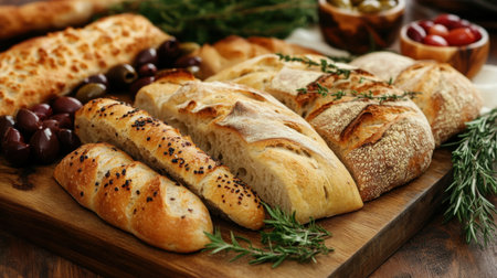 A captivating assortment of artisan breads accompanied by fresh herbs and olives, creating a delightful centerpiece for any dining table or culinary display.