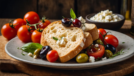 A Fresh artisanal breads with cheese and tomato spread on rustic table