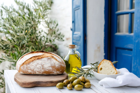 Freshly baked bread, olive oil, and green olives are arranged on a white wooden table, evoking the flavors of the Mediterranean