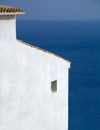 White building by clear blue Mediterranean sea, Mallorca, Balearic islands, Spain.
