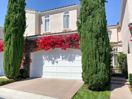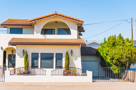 Beautiful house with nicely landscaped front the yard and clear blue sky on background in small beach town in California.