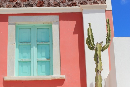 Colorful facade of a house with itsgreen closed shutters, red facade and cactus by beautiful weather, Santorini, Greece