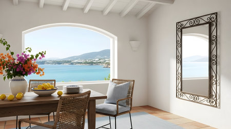 This image depicts a tranquil dining room with a stunning ocean view. The room features a wooden dining table accompanied by wicker chairs, creating a cozy and inviting atmosphere. A large decorative mirror adorns the wall, reflecting the serene coastal landscape. A vase filled with vibrant flowers adds a touch of natural beauty, while a bowl of fresh lemons suggests a refreshing ambiance. The white walls and wooden ceiling enhance the room's bright and airy feel, making it an ideal space for enjoying meals while appreciating the scenic ocean vista.