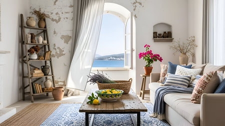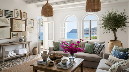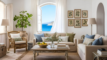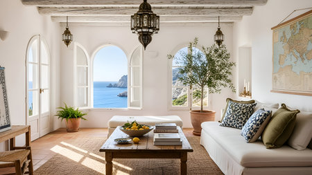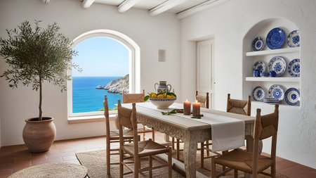 This image depicts a serene coastal dining room with Mediterranean decor. The room features a large arched window offering a breathtaking view of the ocean. The dining table is set with a white tablecloth and surrounded by wicker chairs. Decorative blue and white plates adorn the wall, adding a touch of traditional Mediterranean charm. A potted olive tree in a large terracotta pot sits in one corner, enhancing the coastal ambiance. The overall atmosphere is calm and inviting, perfect for a relaxed dining experience with a view.
