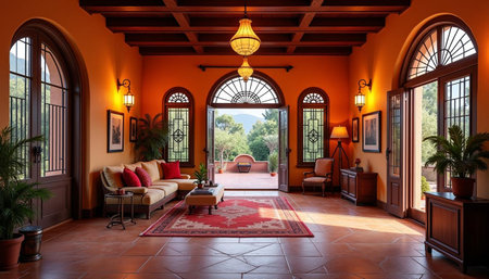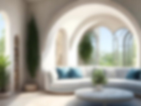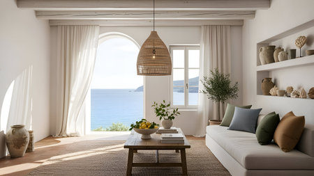 A contemporary living room featuring a blend of natural and modern elements. The room includes a comfortable white sofa adorned with blue and white throw pillows, a wooden coffee table with a bowl of fruits, and a large arched window allowing ample natural light. Decorative vases in blue and terracotta are placed on a white console table, and a potted olive tree adds a touch of greenery. The space is completed with a patterned rug and a framed artwork on the wall.