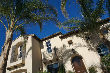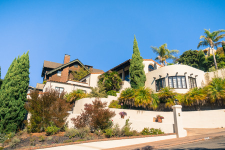 Beautiful houses with nicely landscaped front the yard and clear blue sky on background in a small beach town in California.
